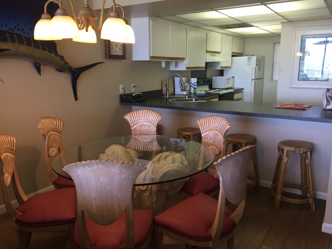 Exclusive gulf front condo fully furnished with all the necessities and comforts of home. SunSeeker is a three story complex with a total of 6 units situated on a quiet boulevard off South Thomas Drive. SunSeeker Unit #2 is a ground floor condo and parking is provided just outside your door. This condo is a favorite for those who do not want to climb stairs and those who enjoy the additional green grass area surrounding the patio. Condo has a large private patio for enjoying a cup of coffee, a refreshing cold beverage, and always a great spot for watching the dolphins play in the surf or taking in a good book. Condo sleeps 6 guests comfortably with a King size bed in the Master, a Queen size bed and two additional twin size beds in the second bedroom, and additional sleeping possibilities in the living area. Master bathroom has an over-sized jetted soaking tub, separate walk-in shower and dressing vanity with double sinks. The kitchen comes fully equipped with all appliances, cooking utensils, eating utensils, pots/pans/bake ware and dishes. There is a washer and dryer in the unit and all linens and towels are provided. Free Wi-Fi provided and living room/ bedrooms have flat screen, cable TV and DVD.