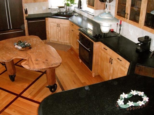 * The home is built with top-quality materials and attention to every detail. It has stone decking, solid brass ship’s lighting fixtures, and plenty of ventilation-providing windows. The front door is big and beautiful -- 4 feet wide locally-milled eucalyptus with a stained-glass window panel depicting the fish found in the bay. On the inside there is the same brass ship’s lighting, local hardwoods for the cabinets and floors (jacaranda, silky oak), granite, copper, and a beachy white-washed ceiling with indirect and direct lighting. It is friendly, comfortable, and ultimately luxurious.