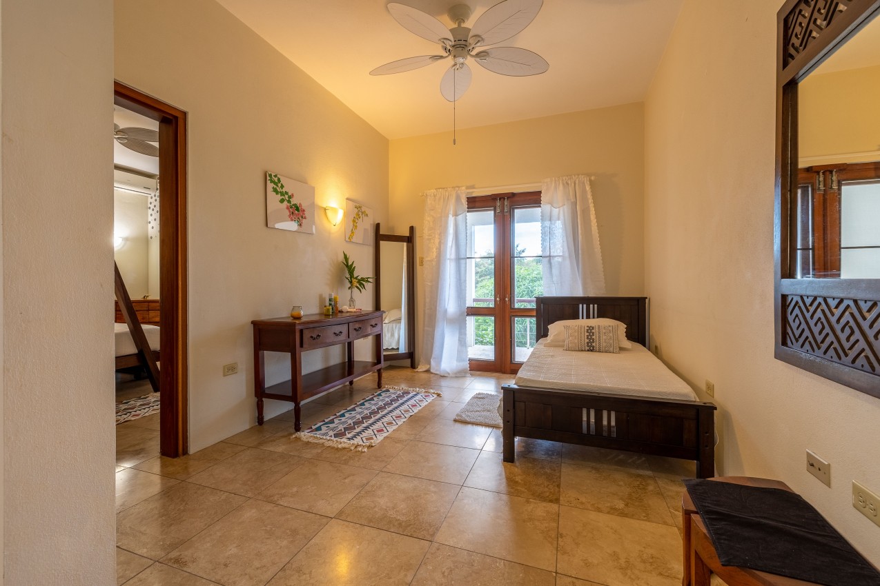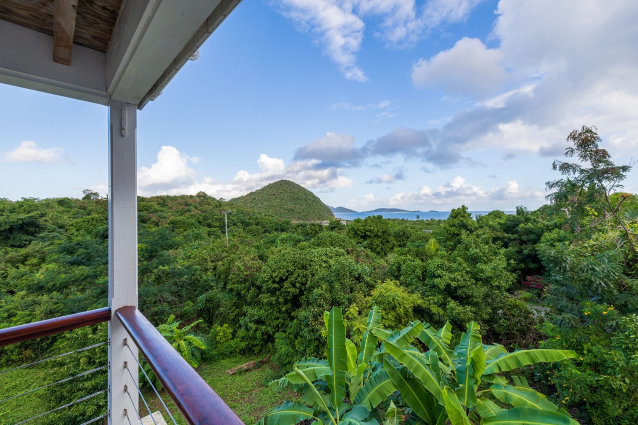 The spacious & elegant living room upstairs has generous seating with beautiful hand-made hardwood furniture. Dining table & chairs for 8, along with a well-equipped kitchen. There is ample cooling from the six ceiling & floor fans to enhance the cross-flow of the ocean breeze. The large verandas on both floors add to the sense of space & feature great views of the lush green hillsides. The sky over the lush Palm Grove and the blue ocean, the islands of Jost Van Dyke, Sandy Spit shimmer in the distance.