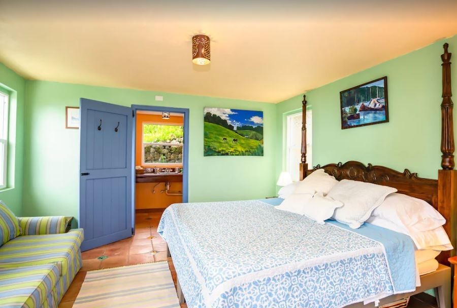 The Master Bedroom is air-conditioned with its vaulted ceiling and own private veranda. The views are reaching out over the ocean. Its King 4 Poster Bed is reached by stairs leading up from the living area. There is also a comfortable sofa to relax in after a hard day on vacation. There is a table and chairs if you enjoy reading or you want to do a bit of work whilst you are on island. The en suite Bathroom has a walk-in shower, twin sinks (his and hers).