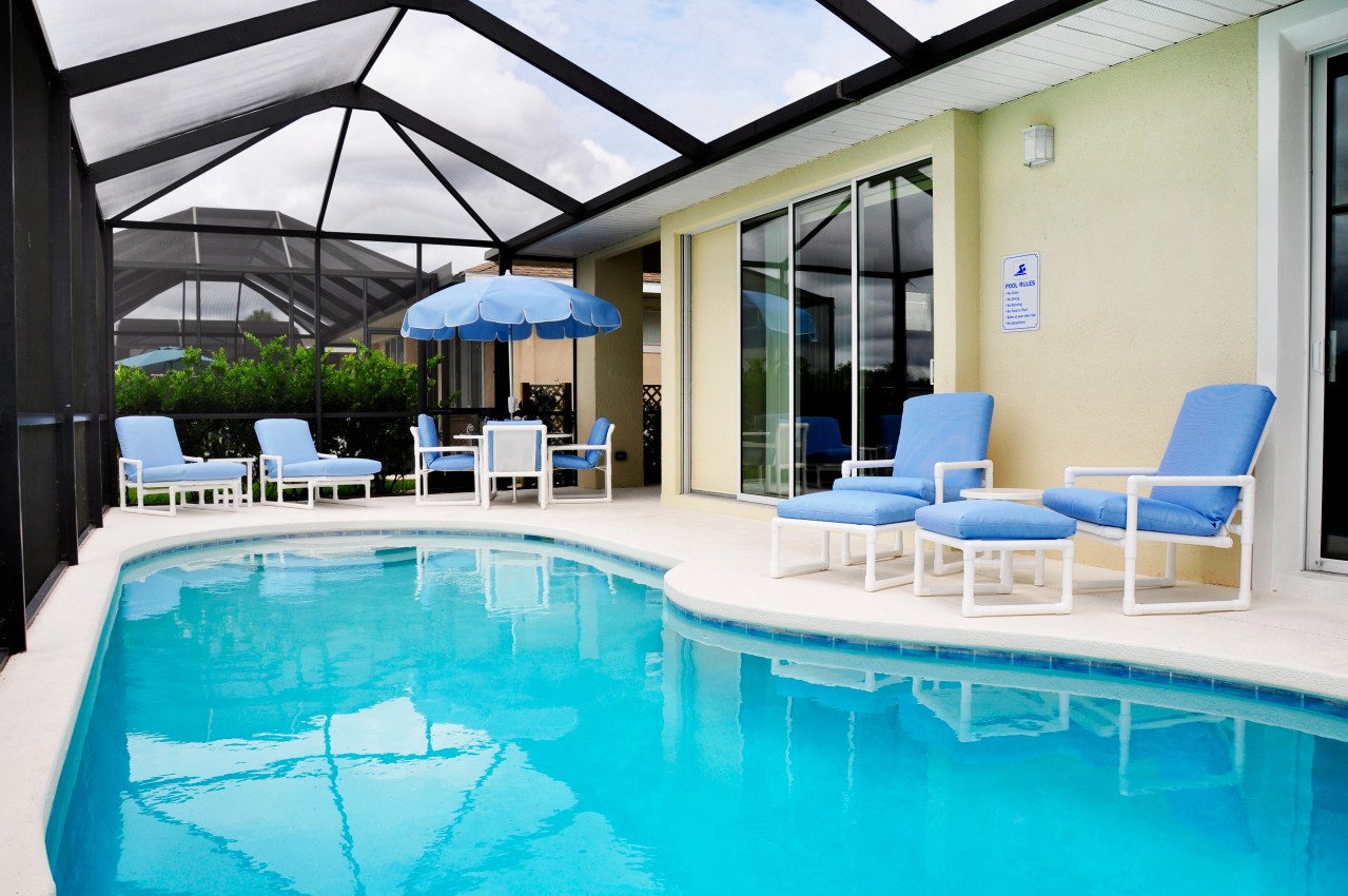 Security and Seclusion: The Lake House at Sunset Lakes is located in the prestigious gated community Sunset Lakes in Kissimmee. Sunset Lakes features an electronic key code access and surveillance system. Your access to the Lake House is also controlled by your unique electronic access code which is valid for the duration of your stay. Sliding doors in the living room, master bedroom and dining area overlook the private pool; these are all secured by modern easy to use safety locks and alarms for added child safety.. The sliding doors to the pool face south towards the lake so there are no neighbors to disturb your enjoyment of the tranquility.