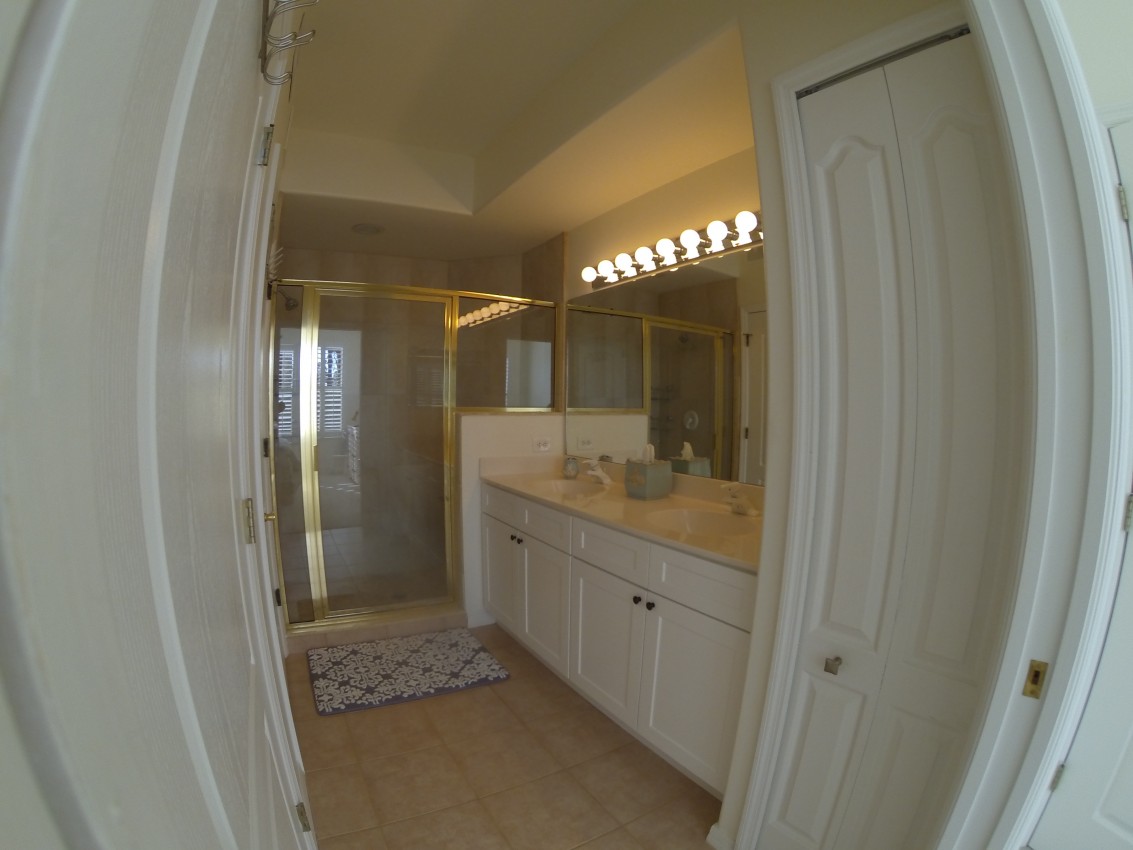 The master bedroom is cozy and has views of the 5th green and 6th tee. The adjoining master bath features a private toilet compartment, an over-sized walk-in shower, and a double sink vanity.