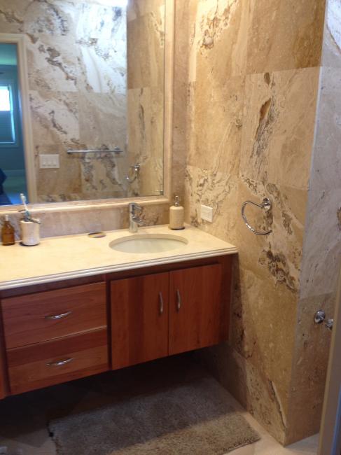 The unit was recently renovated 100% including new cathedral ceilings, a 24 inch stone diagonal floor throughout, and a new kitchen, laundry room, marble and glass master bedroom and shower, totally tiled second bathroom, etc. It's all newly painted and has many custom features including crown moldings, new appliances, etc