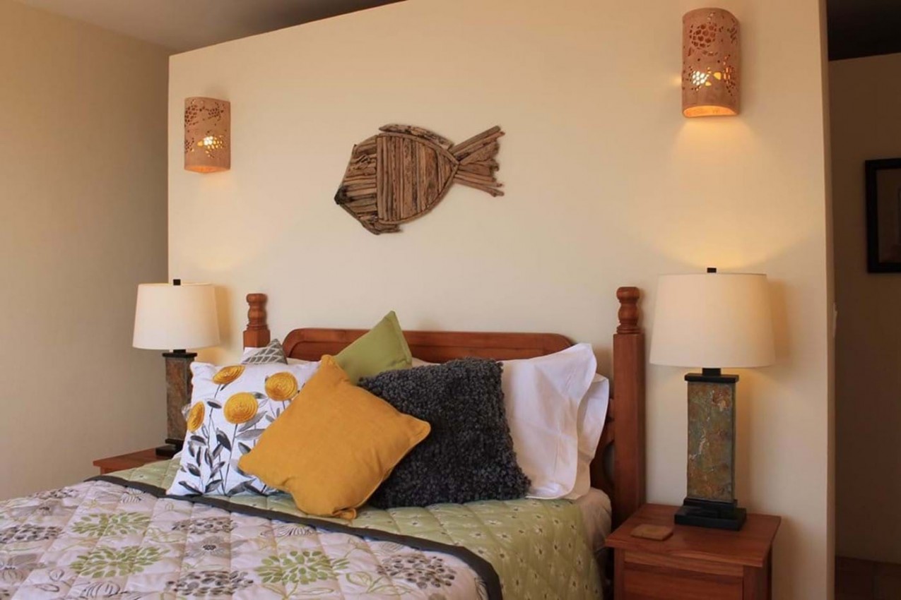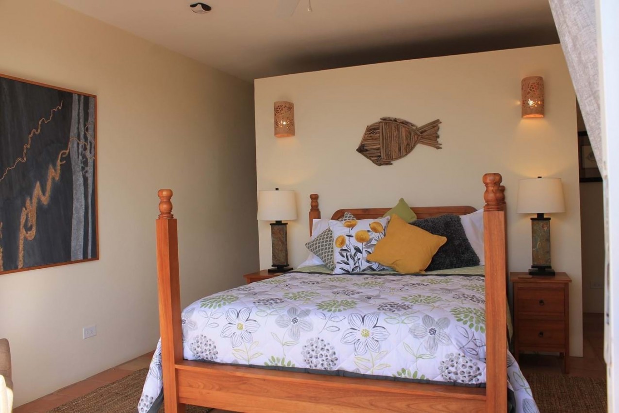The third bedroom is very private & leads down from the main deck via steps to an outdoor space overlooking trees & landscape. You can enjoy the sea views & ocean sounds at night if you wish to. This bedroom has a low 4 poster Queen Bed with local art work to give a contemporary feel to this space. Again luxury Egyptian cotton is featured throughout the property. The bathroom is finished with stone Travertine and natural pebbles in your lovely spacious walk in shower. At Alfresco you can enjoy the privacy of this bedroom. Ideal for 2 couples staying, so you have some privacy.