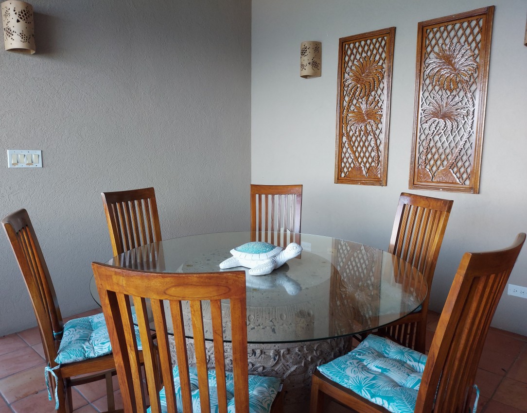 The mezzanine leads you to the Kitchen with its well-appointed high end units with granite counter-tops & stainless steel appliances. Even the kitchen sink is a great place to look out at the amazing sea view. Should you need any provisions for your arrival, just let us know & this can easily be arranged. The Dining Room beacons you from the kitchen with its majestic views of the islands. The glass & stone table is bespoke in this open air pavilion & gives a nice airy feeling to your dining experience. The dining area is also a great place at night which provides an elegant setting for dinner, whether you are cooking yourself or if you decide to bring a chef in.