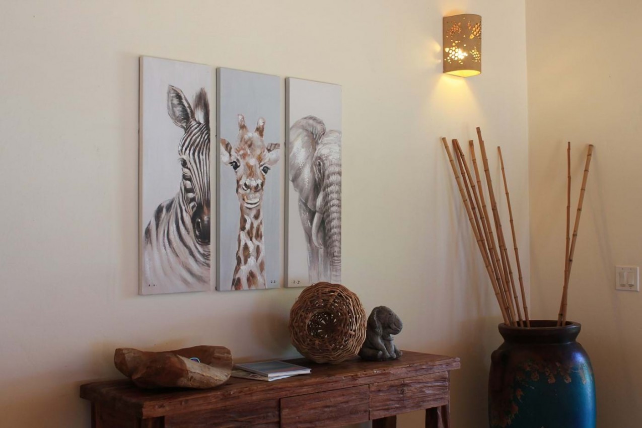 The bedroom pavilion offers an upper level Master Suite. This has beautiful views of the islands & beyond from the balcony & spacious outdoor private deck. The bathroom is finished with a gorgeous stone Travertine & natural pebbles, the oversized shower offers you an invigorating experience. You can marvel at the wonderful wood ceiling as you look up from your king size bed handcrafted in reclaimed teak from Bali. You will be sleeping under Egyptian cotton percale which will give you a luxurious nightโs sleep. If you stay in October, there is a wonderful Jacaranda tree full of cotton like flowers which cascades over the outdoor private terrace leading out from the bathroom. There is also an extra single bed which can be used, should you wish to have one of the children in with you.