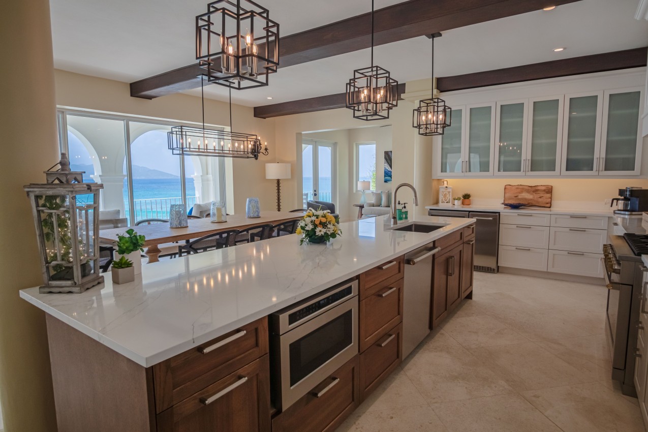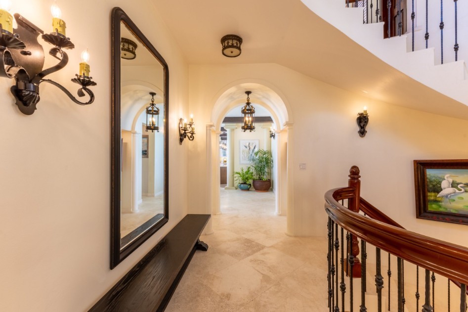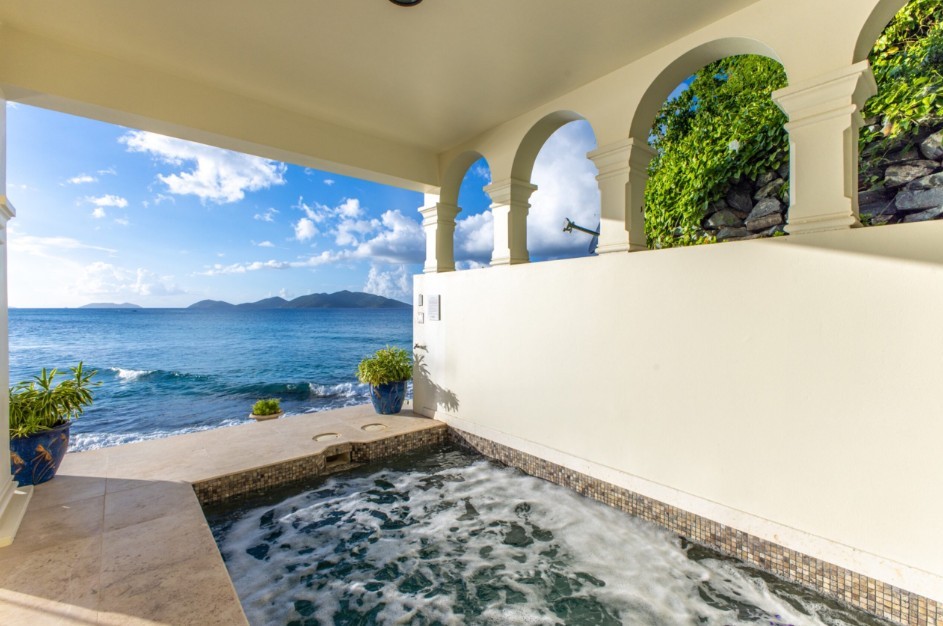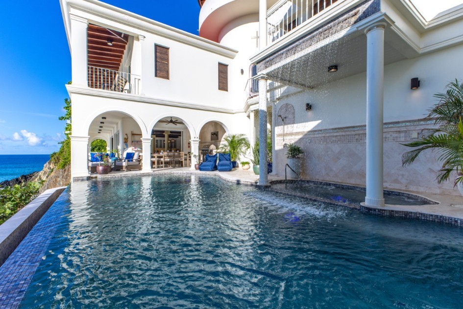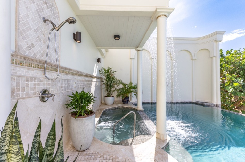 Mare Azzurro is a euphoric one of a kind property that will heighten your senses like no other. A stunning round Mediterranean tower replete with a grand cantilevered marble staircase, turned mahogany rail and antique chandelier from a Spanish Monastery, connects all spaces in the villa. The villa has a Great Room that opens completely up to expansive wrap around covered porches opening to an elevated swimming pool and a large custom kitchen, perfect for entertaining. The open kitchen is every chefโs delight, including 2 dishwashers, a 6 burner commercial stove, a large panelled refrigerator/freezer, floor to ceiling maple raised panelled custom cabinetry and a hidden flat screen television that can be viewed from the granite breakfast bar that seats ten. The entire floor has an integrated sound system. Walk right out from the great room to the state of the art glass elevated mosaic tiled heated infinity pool that joins with the sea. The pool has two waterfalls, one European therapeutic massage, and one rain, with amazing views, surrounded by columns and arches. On the deck enjoy the fully equipped outdoor kitchen with infra-red stainless steel BBQ, gas burners, sink and refrigerator.