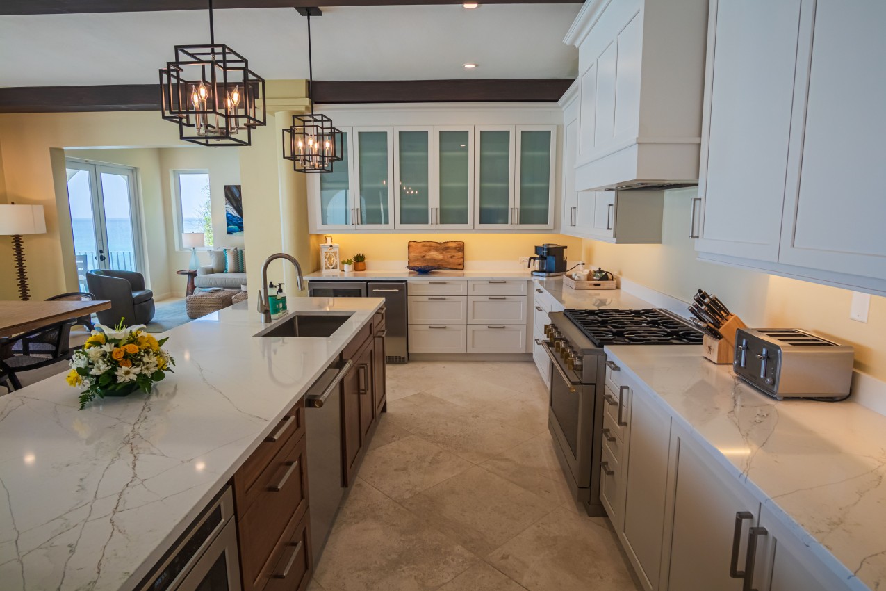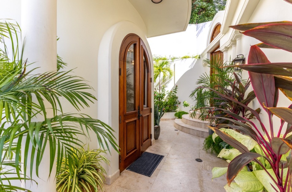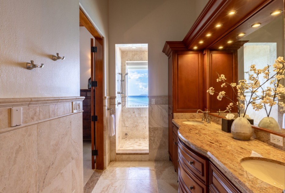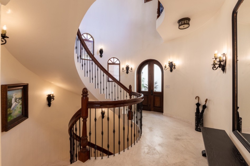Mare Azzurro is a euphoric one of a kind property that will heighten your senses like no other. A stunning round Mediterranean tower replete with a grand cantilevered marble staircase, turned mahogany rail and antique chandelier from a Spanish Monastery, connects all spaces in the villa. The villa has a Great Room that opens completely up to expansive wrap around covered porches opening to an elevated swimming pool and a large custom kitchen, perfect for entertaining. The open kitchen is every chefโs delight, including 2 dishwashers, a 6 burner commercial stove, a large panelled refrigerator/freezer, floor to ceiling maple raised panelled custom cabinetry and a hidden flat screen television that can be viewed from the granite breakfast bar that seats ten. The entire floor has an integrated sound system. Walk right out from the great room to the state of the art glass elevated mosaic tiled heated infinity pool that joins with the sea. The pool has two waterfalls, one European therapeutic massage, and one rain, with amazing views, surrounded by columns and arches. On the deck enjoy the fully equipped outdoor kitchen with infra-red stainless steel BBQ, gas burners, sink and refrigerator.