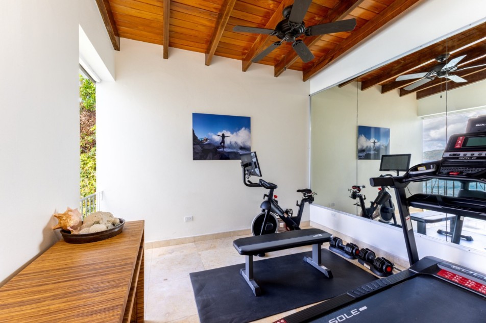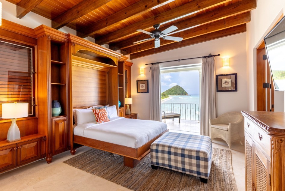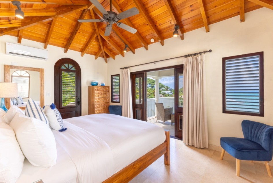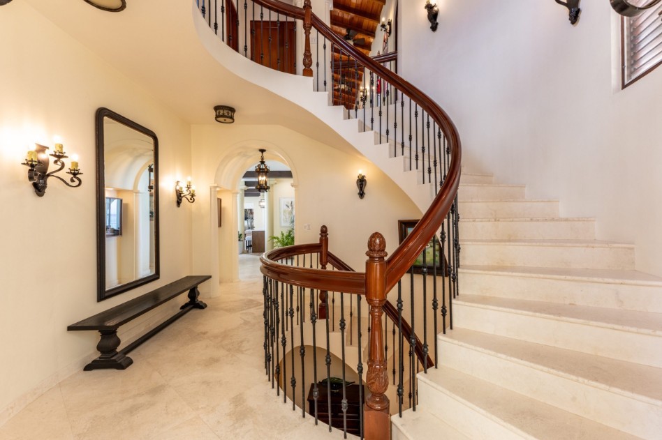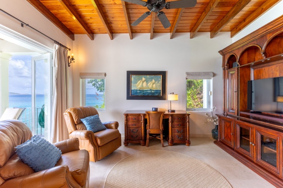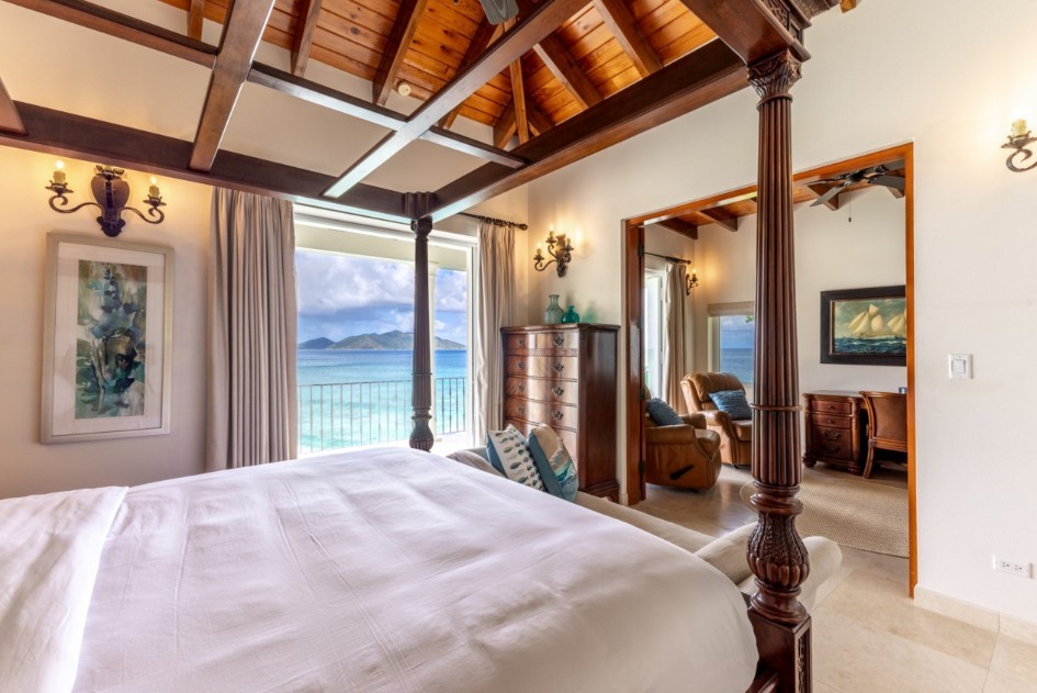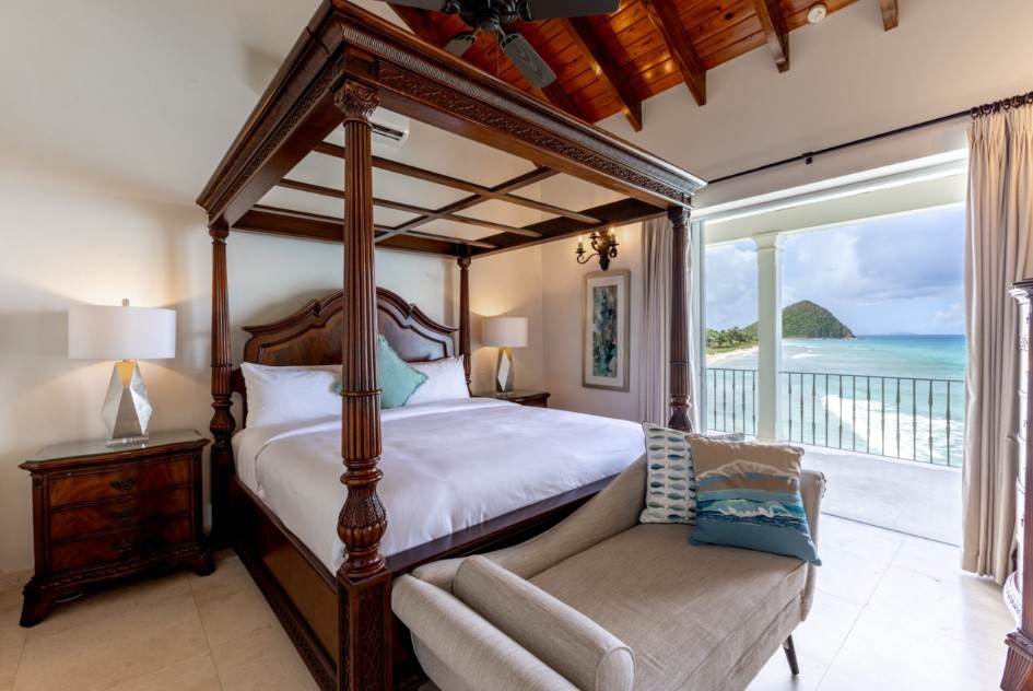 The villa has 2 master suites with king sized wooden carved four poster beds and exquisite furniture, their own sitting rooms, large walk in closets and marble bathrooms, with walk in showers. All bedrooms have glorious sea views, with pocketing doors and roll down shutters that open to a large veranda. One suite has its own Hot Springs Spa with amazing views overlooking the long sandy beach and across the ocean beyond, while the other has 2 bathrooms and a Murphy bed that converts the sitting room into another bedroom perfect for small children or guests. The artistโs studio has its own private balcony and uninterrupted view of the beach, ocean and myriad of islands beyond. The studio has its own bathroom, kitchen, bedroom and private entrance. At the top of the tower one arrives at the media room with a wet bar and home theatre in the round. Perched high above the activity below, this circular space provides another welcome retreat to relax, enjoy and be entertained in total comfort and seclusion.