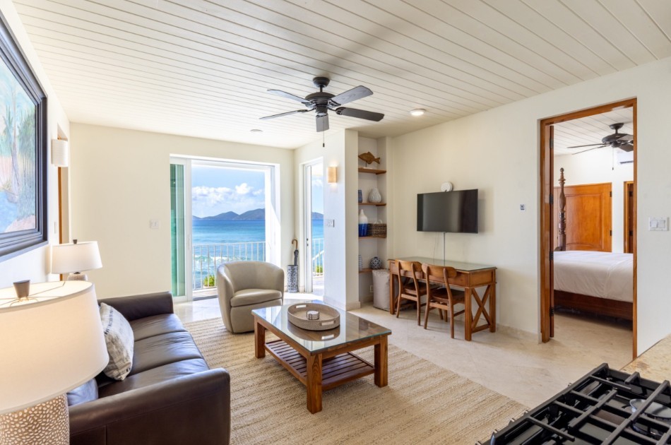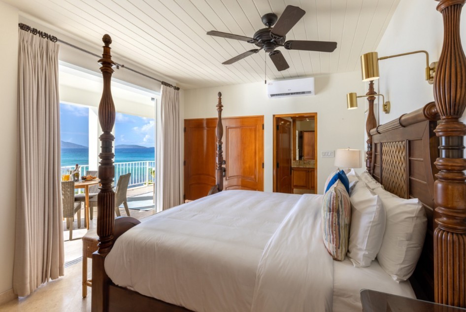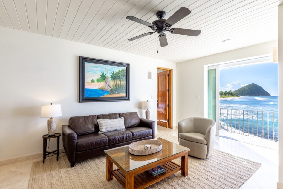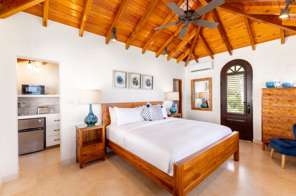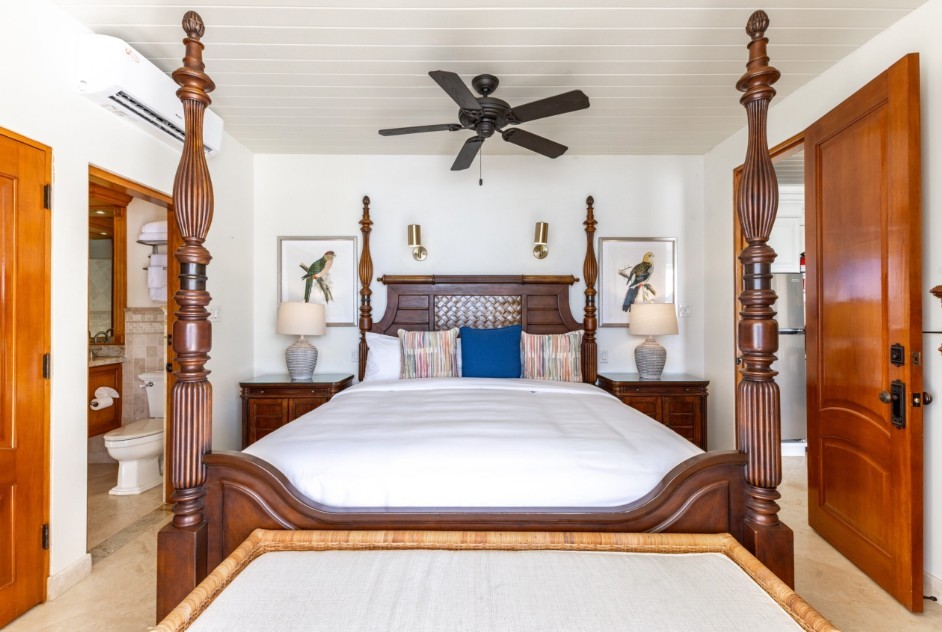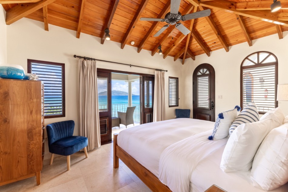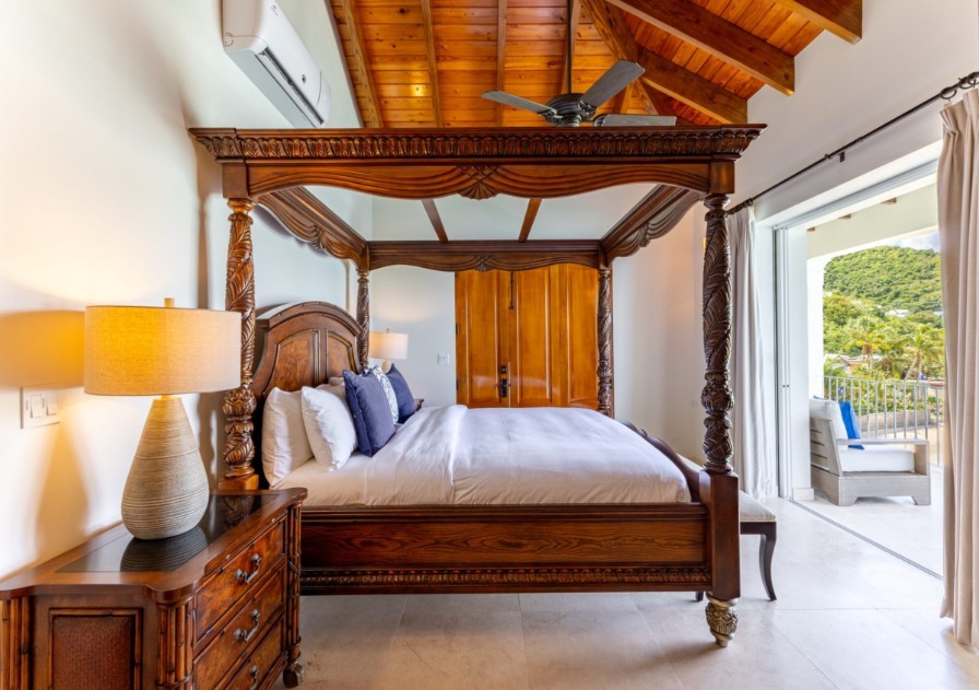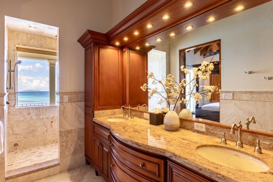 The villa has 2 master suites with king sized wooden carved four poster beds and exquisite furniture, their own sitting rooms, large walk in closets and marble bathrooms, with walk in showers. All bedrooms have glorious sea views, with pocketing doors and roll down shutters that open to a large veranda. One suite has its own Hot Springs Spa with amazing views overlooking the long sandy beach and across the ocean beyond, while the other has 2 bathrooms and a Murphy bed that converts the sitting room into another bedroom perfect for small children or guests. The artistโs studio has its own private balcony and uninterrupted view of the beach, ocean and myriad of islands beyond. The studio has its own bathroom, kitchen, bedroom and private entrance. At the top of the tower one arrives at the media room with a wet bar and home theatre in the round. Perched high above the activity below, this circular space provides another welcome retreat to relax, enjoy and be entertained in total comfort and seclusion.