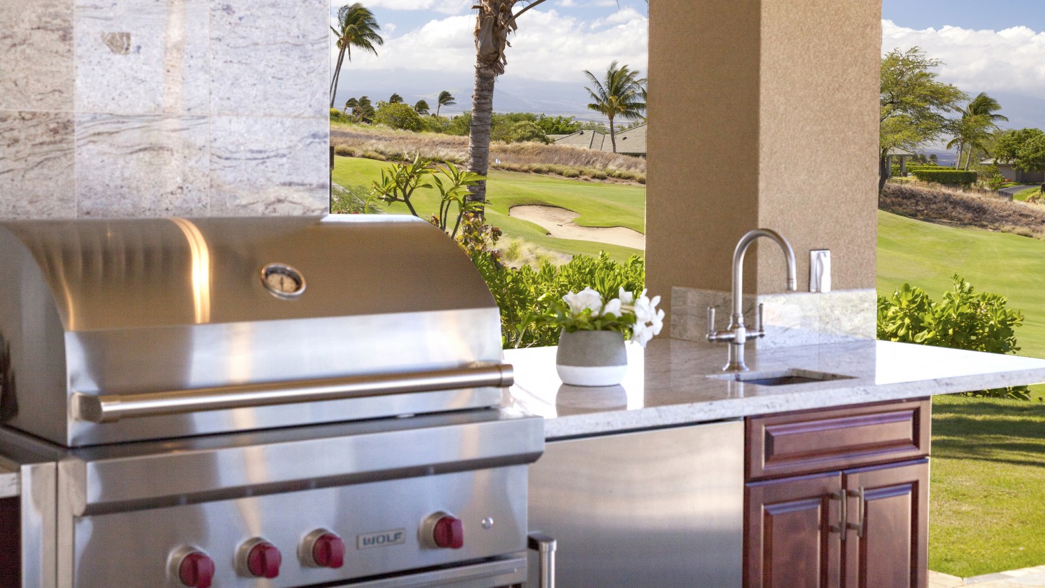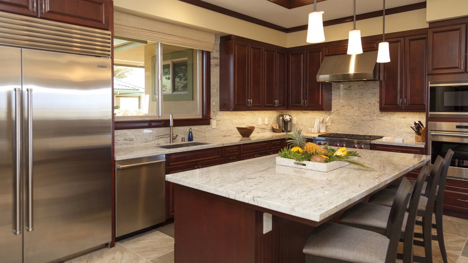 Also in the main house, find a gleaming chef's kitchen with high-end stainless appliances and granite counters. An open-concept, indoor/outdoor layout makes it simple for friends and family to dine together, either inside or al fresco in the sea breeze, then gather on the sectional sofa for a movie on the large flat-screen TV. With multiple lanais — and a total of 3,337 square feet of living space — everyone has a place to relax here.