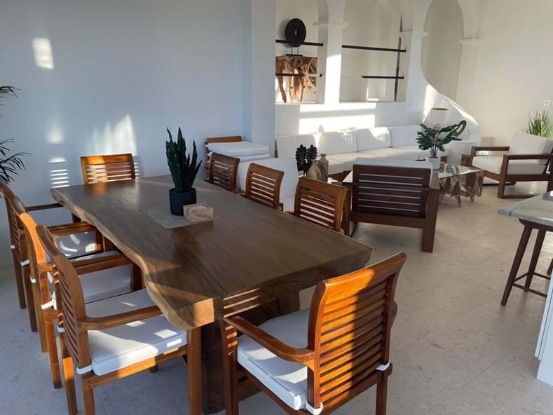 The main house drifts through from the pool terrace, with large sliding doors & open-plan living. The kitchen, dining area allows you to cook & chat with your guests. You have the choice of air conditioning or ceiling fans to keep things cool. A particular feature is the teak dining table which offers up to 8 guests for dining. The living space offers relaxing seating with beautiful ocean views! 65โ TV if you fancy a little downtime from your wonderful vista.