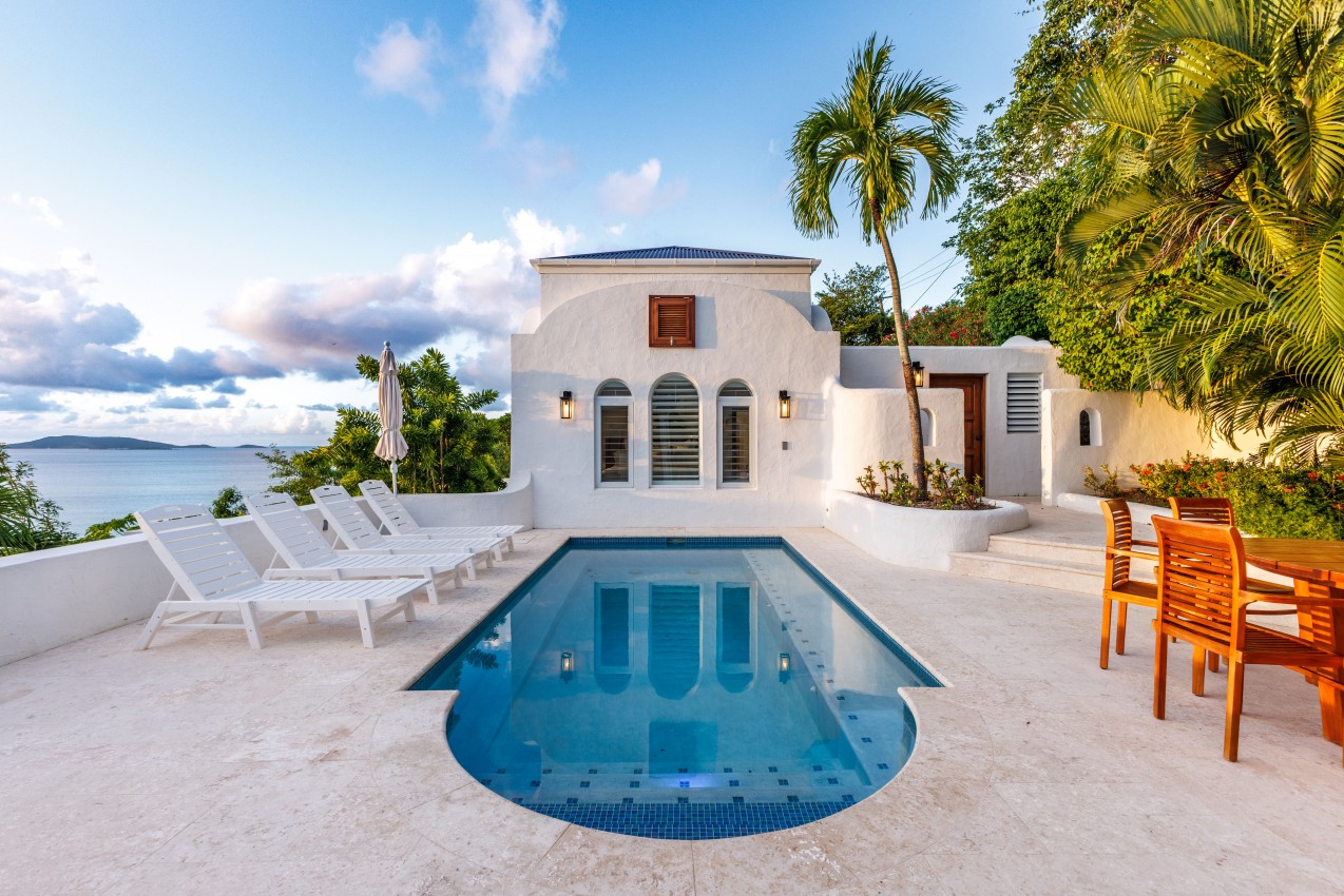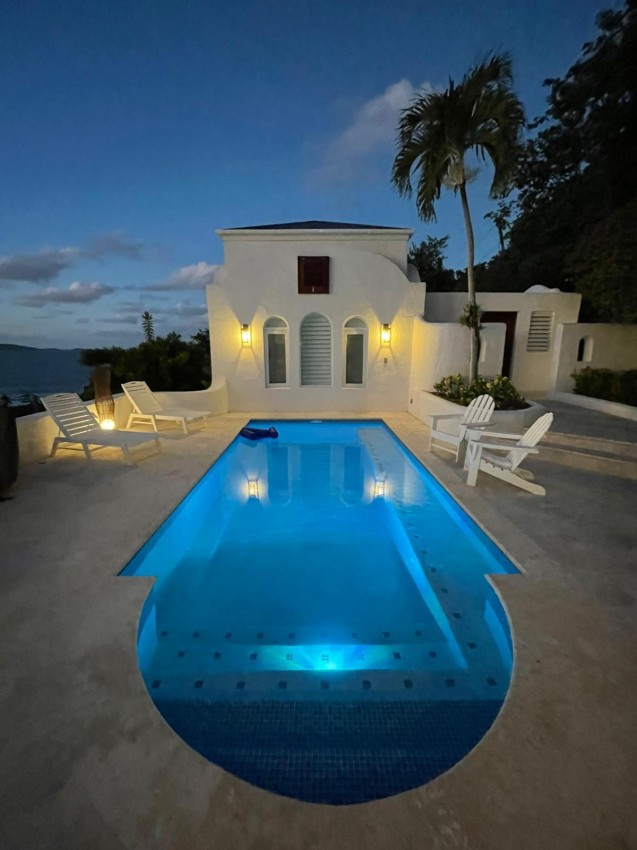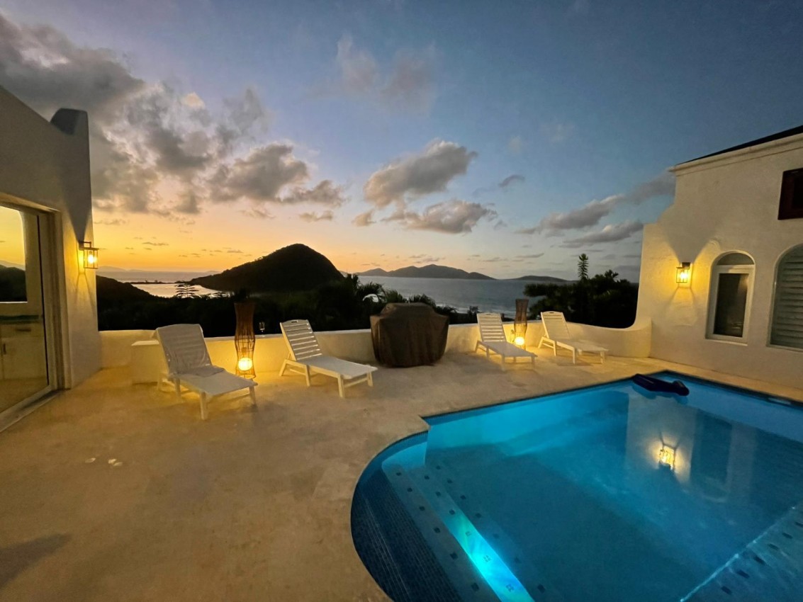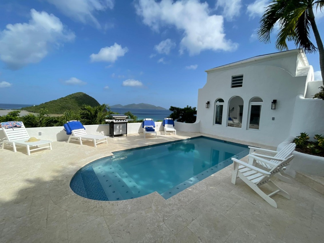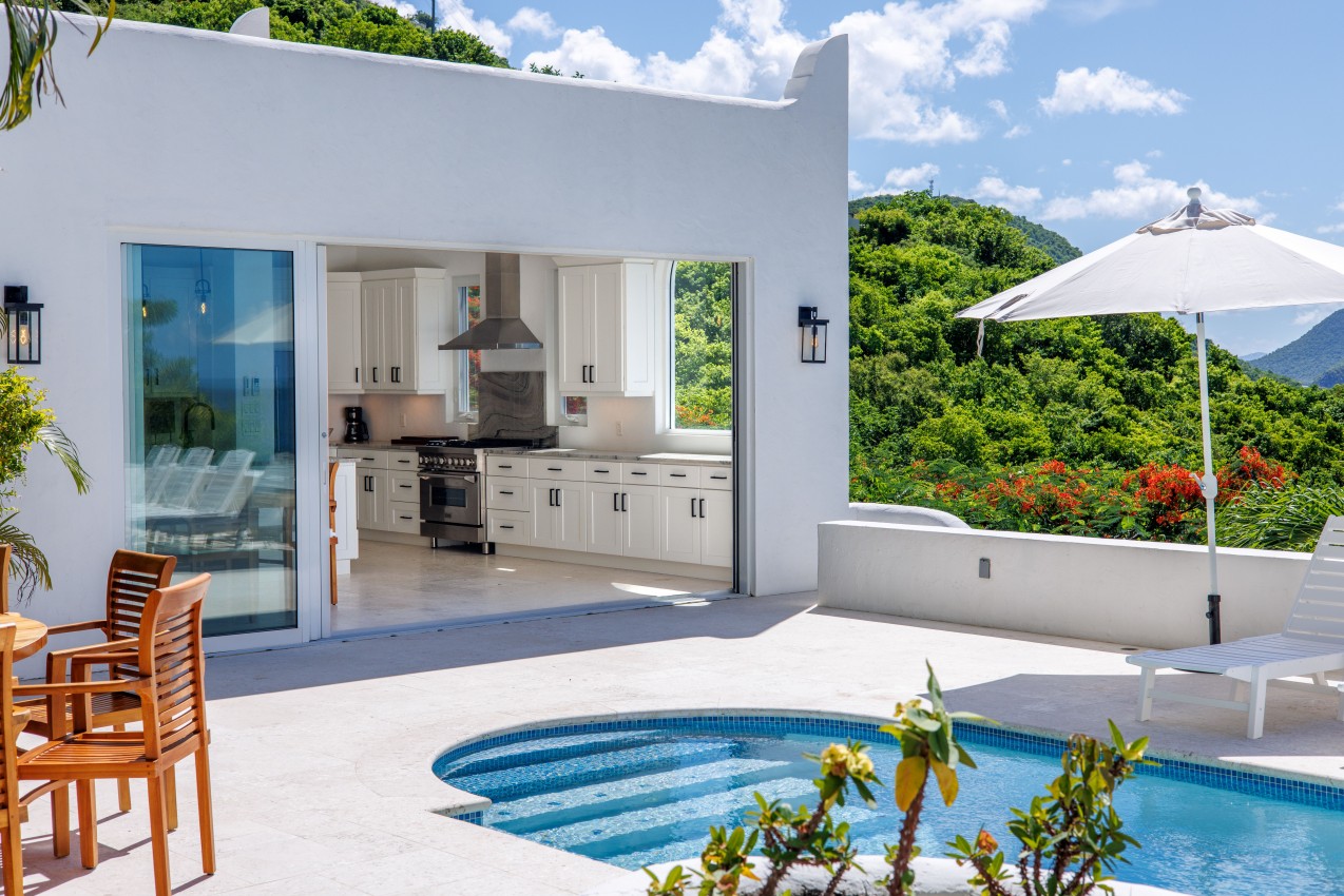 The Mediterranean style to Santorini is just perfect for the islands. A treat which is accessed by a flight of stairs behind the primary suite, you are met with a rooftop terrace with fire pit & stunning views out to Jost Van Dyke. The pool terrace is a great place to hang out, it combines comfort & style in equal measures. Sun loungers around the pool, allow you to relax & enjoy the islands breezes or take a dip in the pool if you are enjoy the sun rays (chargeable to heat the pool upon request). Alfresco dining under the stars or some light lunch maybe. Pool deck has a handy shower, half bathroom & a small deck with a gas BBQ. Ice maker, beach chairs & other essentials are available. Tropical planting throughout.