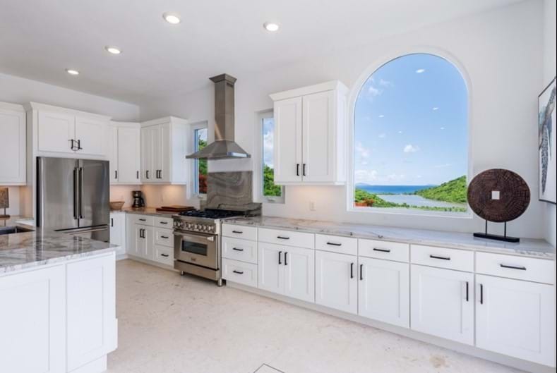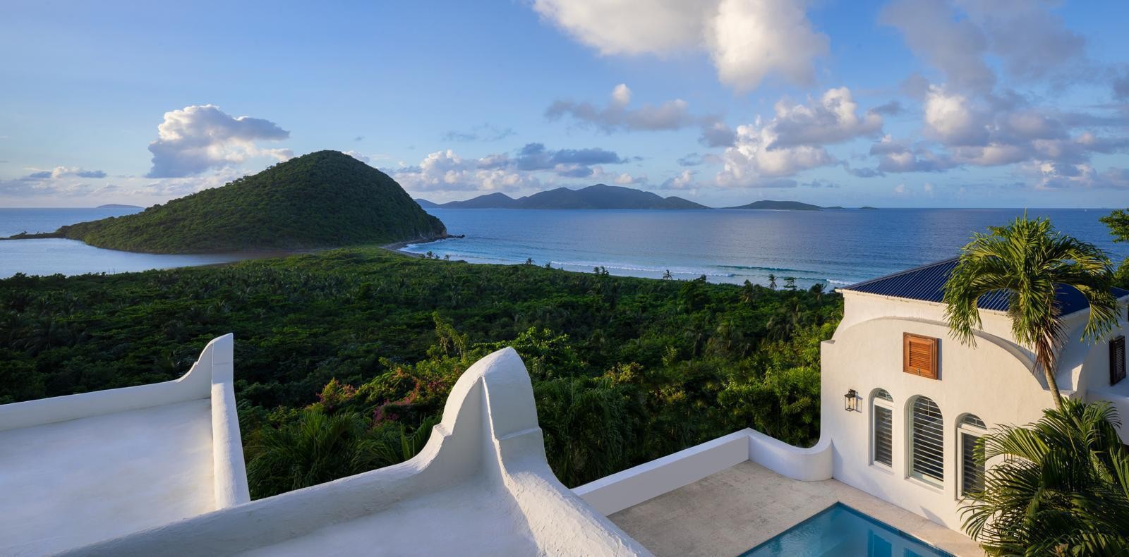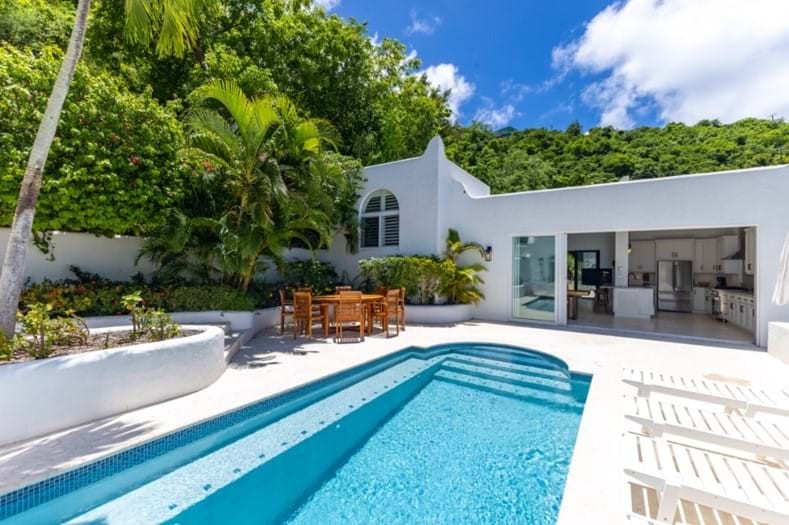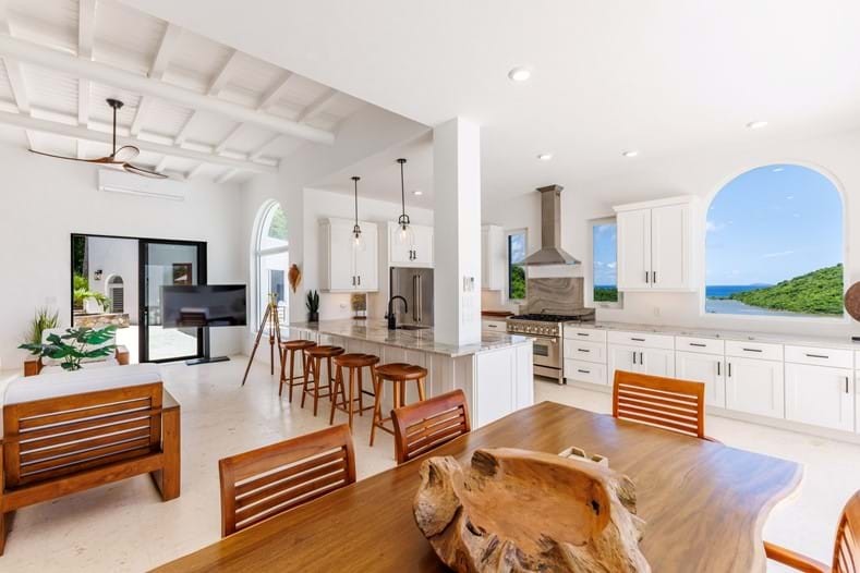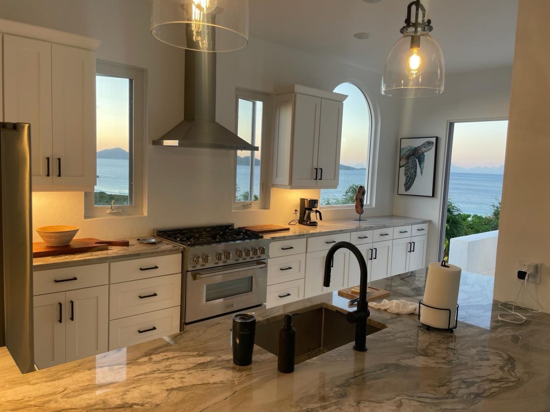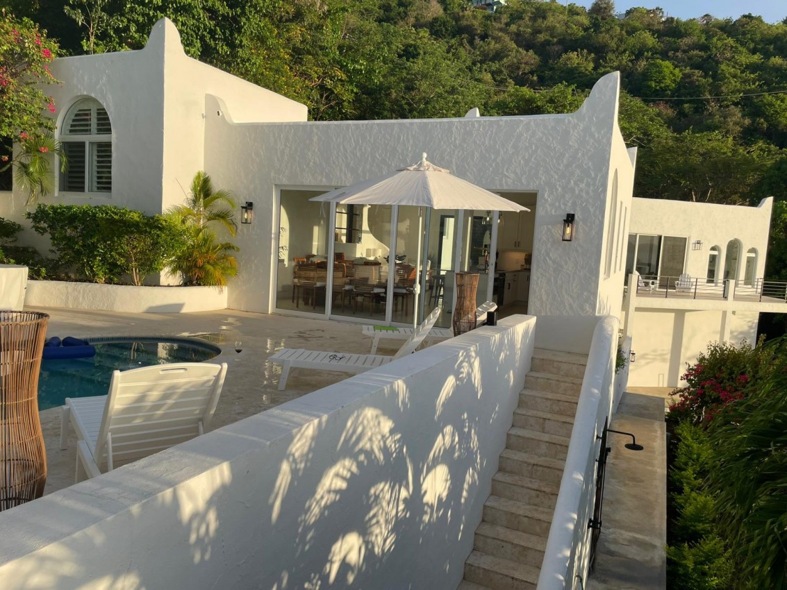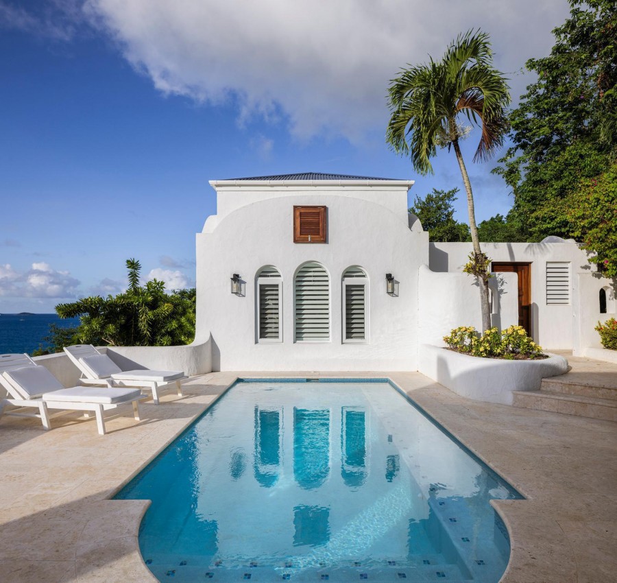 The Mediterranean style to Santorini is just perfect for the islands. A treat which is accessed by a flight of stairs behind the primary suite, you are met with a rooftop terrace with fire pit & stunning views out to Jost Van Dyke. The pool terrace is a great place to hang out, it combines comfort & style in equal measures. Sun loungers around the pool, allow you to relax & enjoy the islands breezes or take a dip in the pool if you are enjoy the sun rays (chargeable to heat the pool upon request). Alfresco dining under the stars or some light lunch maybe. Pool deck has a handy shower, half bathroom & a small deck with a gas BBQ. Ice maker, beach chairs & other essentials are available. Tropical planting throughout.