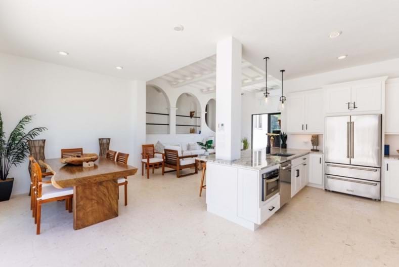 The kitchen offers all the amenities to prepare a sumptuous dinner or family breakfast. The high stools at the breakfast bar are a great start to the day with your smoothie perhaps. The stainless-steel appliances, large double fridge/freezer, 6 burner stove with extraction fan, dishwasher, sandwich maker, rice cooker, ninja blender etc etc