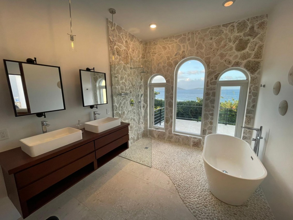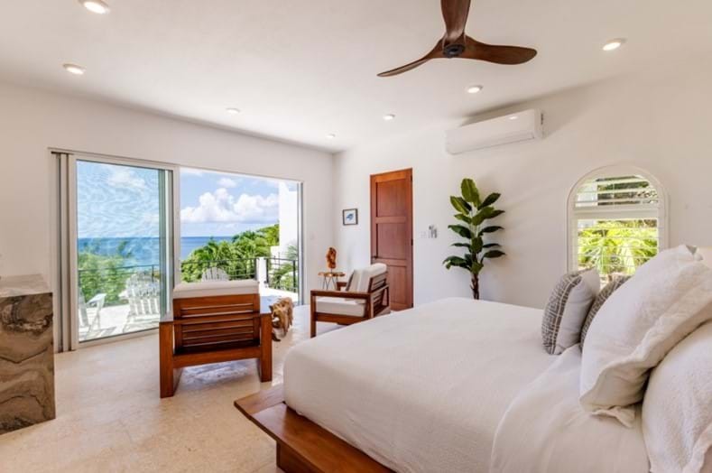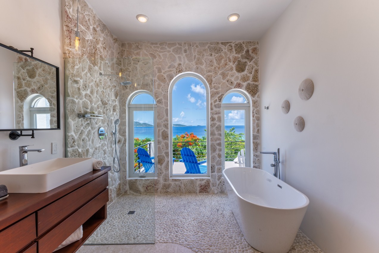 Bedroom 4, another Master perhaps in this private paradise is located a short stroll away from the main house. King bed, air conditioning or ceiling fans, large walk in closet, 65โ TV) & private porch with spectacular ocean views. Coffee maker in your room! The ensuite bathroom has a lovely stone walk-in shower, bathtub, double vanity, soft light enters through a large arched window framing the magnificent views.