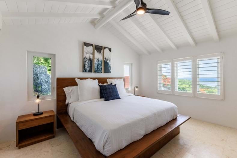 The Master bedroom suite is in the first building, which is the other side of the pool terrace to the main house. This offers a private refuge from the rest of the villa. King bed with a built-in closet, 55โ TV, air conditioning or ceiling fan depending on which you prefer. The ensuite bathroom offers a stone walk-in shower & a private porch overlooking Belmont Pond & Long Bay Beach.