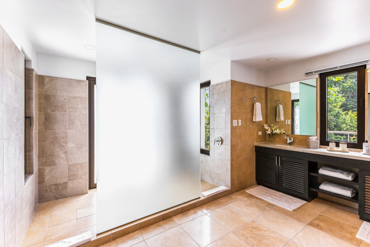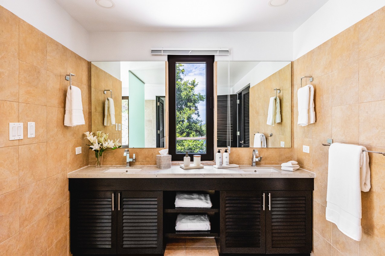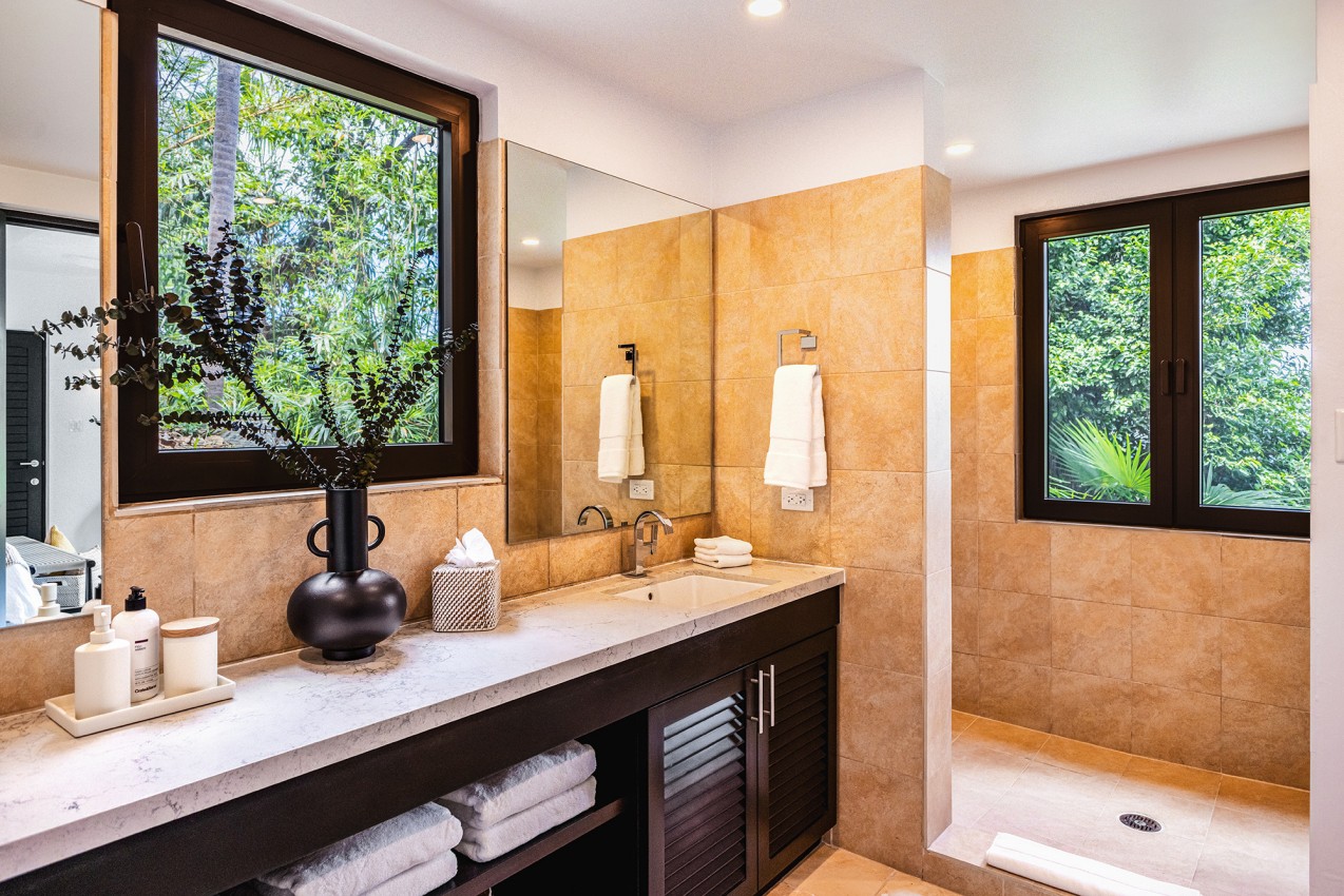 Frenchman’s Paradise with its 4 lovely bedrooms, the Master King bedroom suite is just off the main living floor. The oversized en suite bathroom offers an indoor & outdoor shower. Two more King bedroom suites are on the lower level, both have en suite bathrooms. The fourth bedroom is the Bunks room & is well suited for younger guests, is located on the in-between level. There is a WC & sink adjacent to fourth bedroom & it shares a bathroom with one of the other bedrooms.