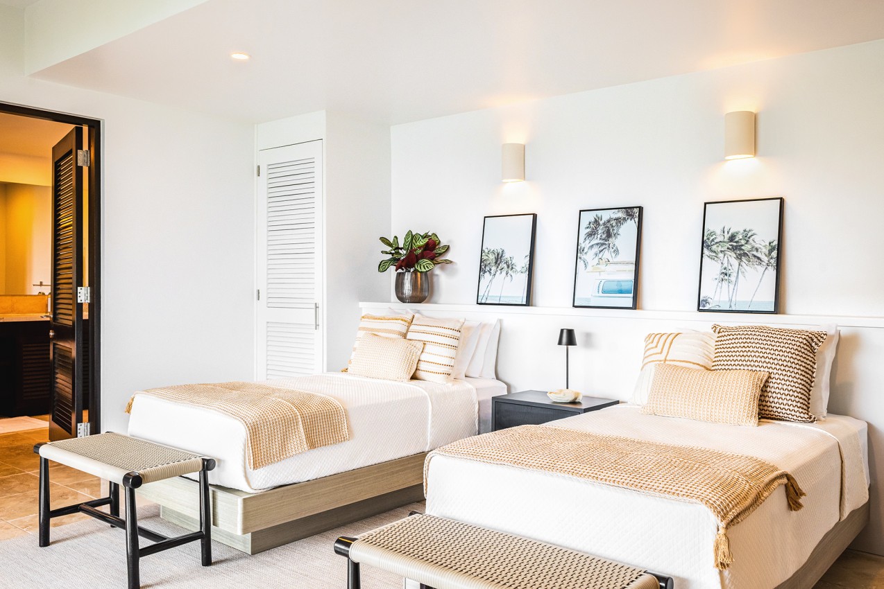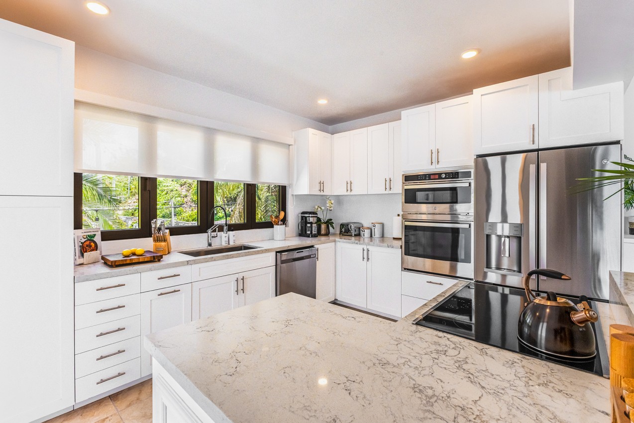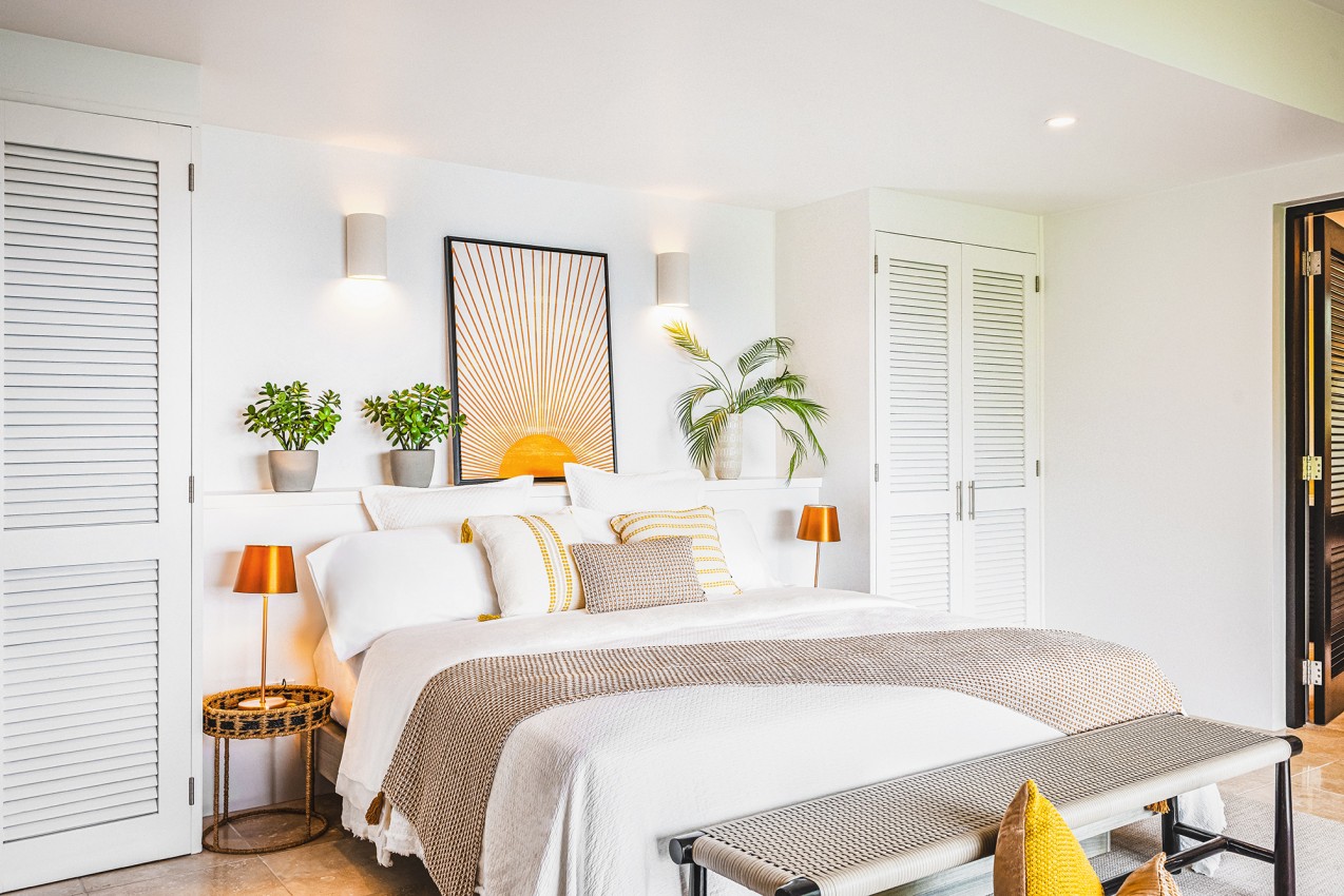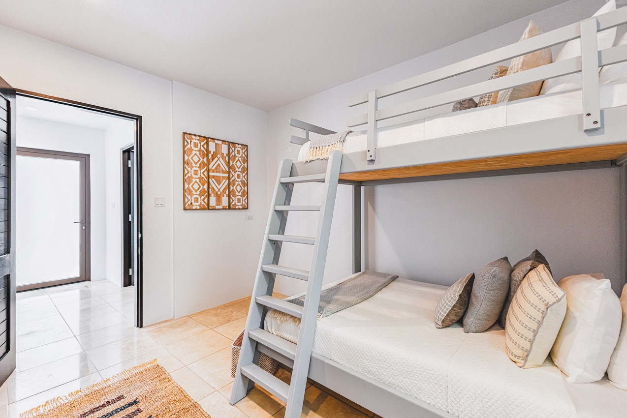 Frenchman’s Paradise with its 4 lovely bedrooms, the Master King bedroom suite is just off the main living floor. The oversized en suite bathroom offers an indoor & outdoor shower. Two more King bedroom suites are on the lower level, both have en suite bathrooms. The fourth bedroom is the Bunks room & is well suited for younger guests, is located on the in-between level. There is a WC & sink adjacent to fourth bedroom & it shares a bathroom with one of the other bedrooms.