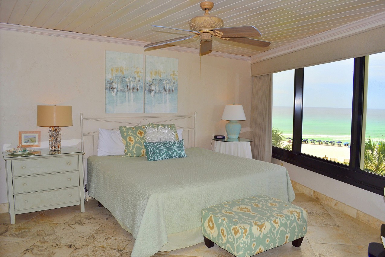 As you step into this open-concept condo you will notice the travertine floors, trendy-rustic lighting above the dining area, wooden ceilings and contemporary furniture. The modern, updated kitchen has all the comforts of home with luxurious, sleek granite counter tops and stainless steel appliances. In the living room you having amazing views from your private, fourth floor balcony that is on the quiet side of the building - you will have no problem relaxing while you listen to the waves! The unit also has 3 HD Sony and Samsung flat screen TVs and two DVD players -the living room is also outfitted with surround sound! The master suite has a luxurious king-size bed, magnificent views of the Gulf from huge picture windows and its own private door to the balcony. The master bathroom has been completely updated with a gorgeous walk-in shower and antique-style vanity -this bathroom is the perfect place to relax after long days in the sun! The second bedroom has a set of twin-size bunk beds and another twin-size bed; when you add this to the queen-size sofa sleeper in the living room, you have room to comfortably sleep seven!